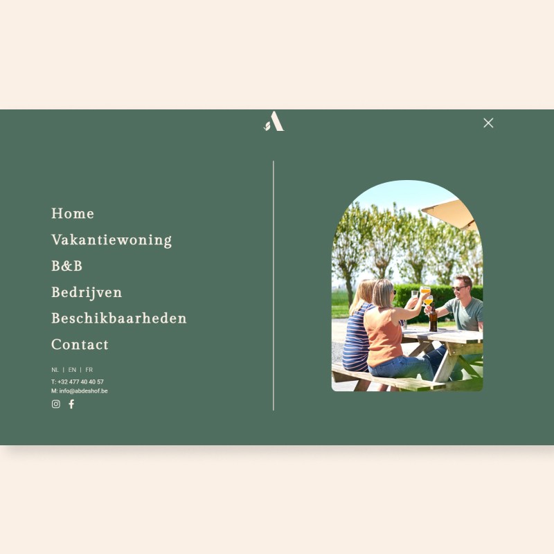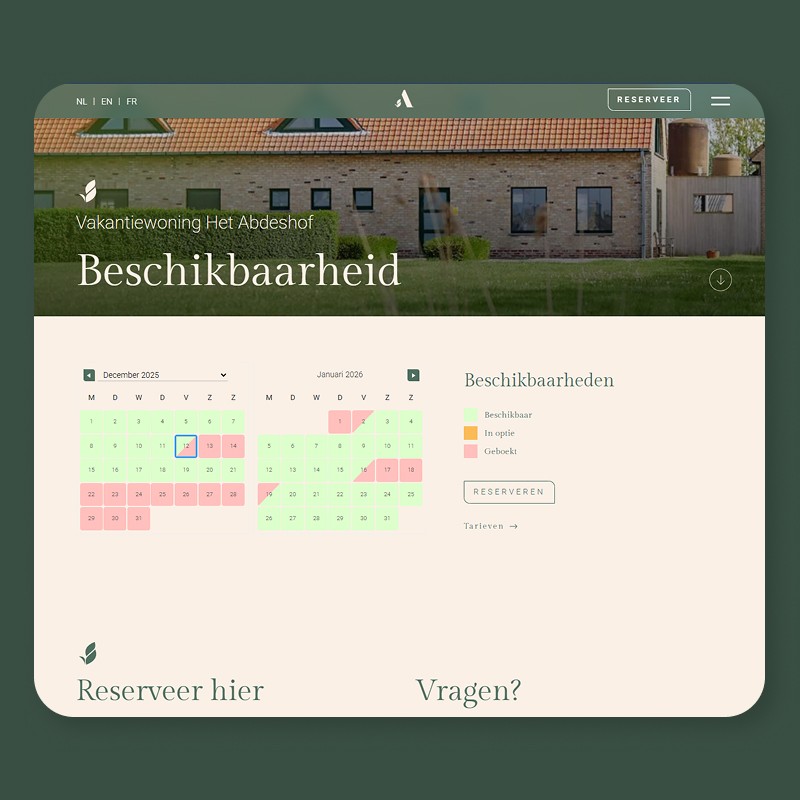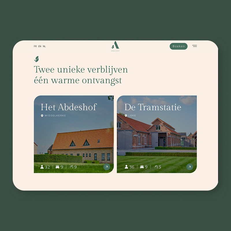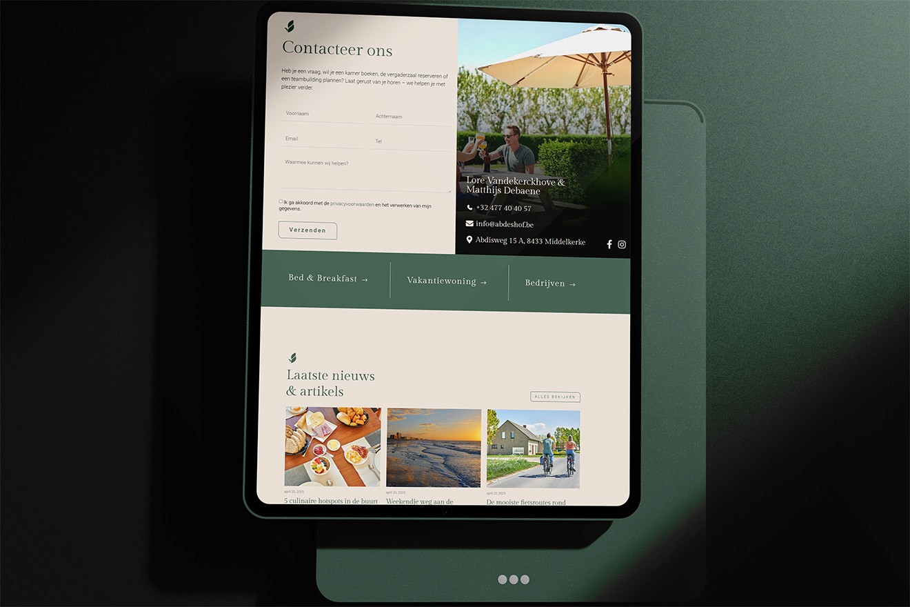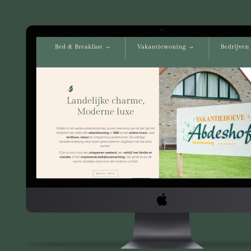 Een warme website voor Abdeshof, een landelijke B&B en vakantiewoning nabij de Belgische kust. De site brengt rust, comfort en alle praktische info overzichtelijk samen voor gasten, families en groepen.