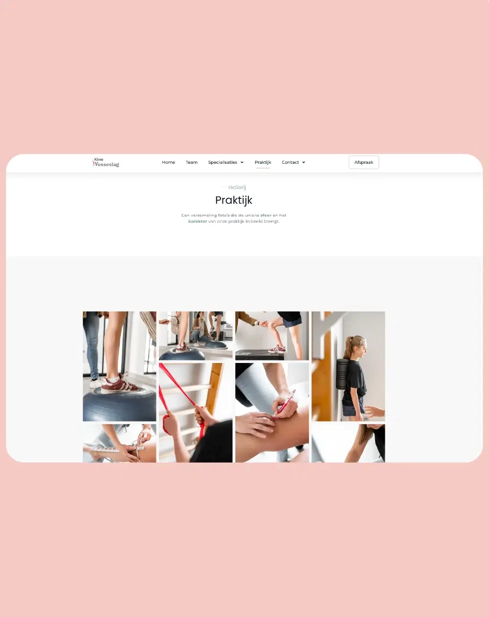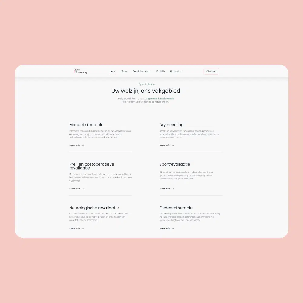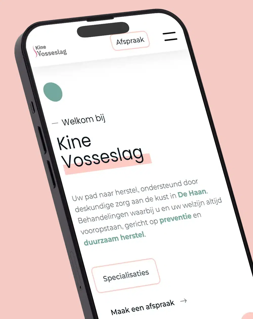 De uitdaging bij het ontwerpen van de website voor Kine Vosseslag was om de essentie en professionaliteit van de praktijk nauwkeurig weer te geven en ervoor te zorgen dat klanten eenvoudig hun weg kunnen vinden naar de verschillende behandelingen.