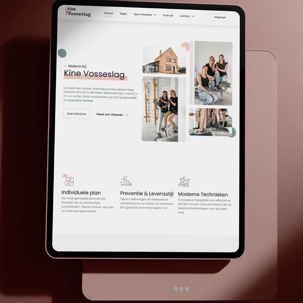 Voor Kine Vosseslag in De Haan ontwierpen we een moderne, gebruiksvriendelijke website die hun zorg en professionaliteit uitstraalt, met een strakke lay-out en vlotte navigatie voor optimale toegankelijkheid.