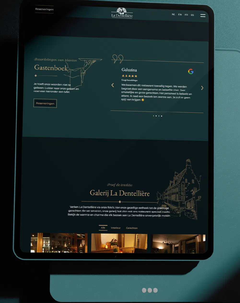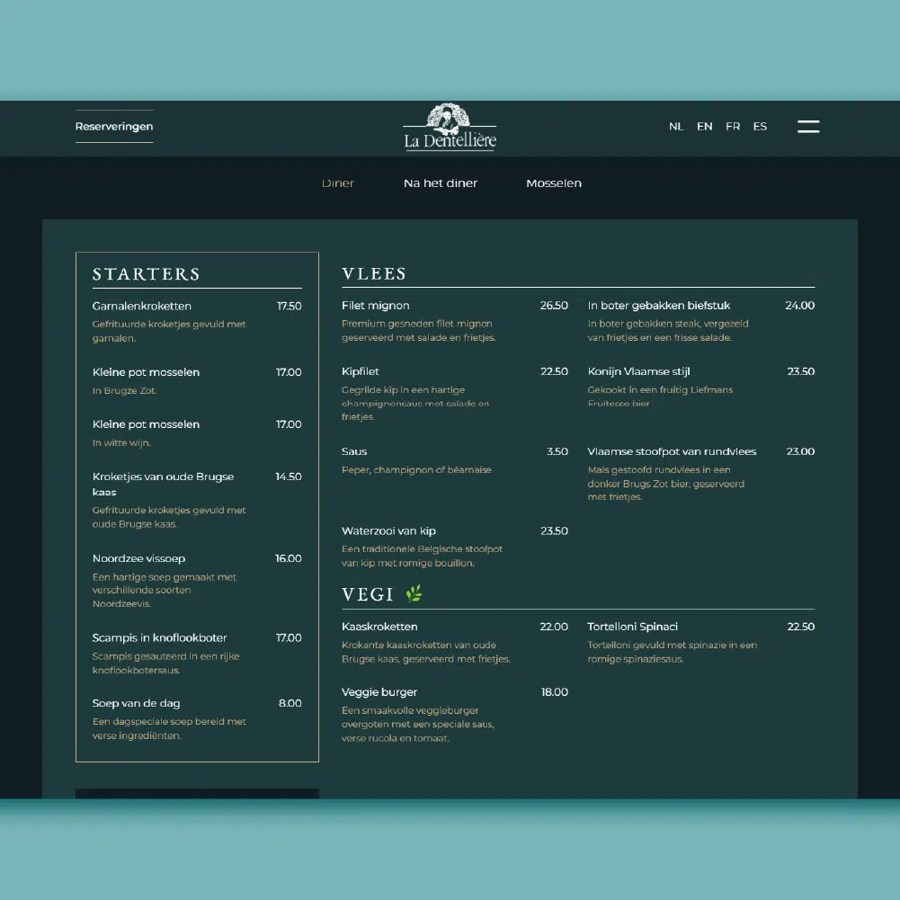 La Dentellière stond voor de uitdaging om hun rijke culinaire traditie en historische charme online te presenteren, zonder het gevoel van authenticiteit te verliezen. Het was essentieel om een gebruiksvriendelijke en visueel aantrekkelijke website te creëren die de unieke sfeer van het restaurant en de prachtige ligging aan het Minnewater weerspiegelt.