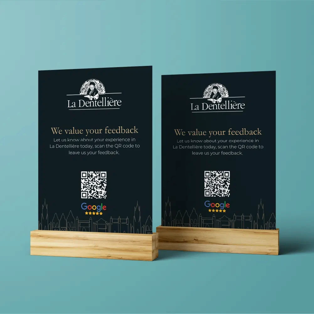 Een stijlvolle tafeldisplay met QR-code, ontworpen om gasten eenvoudig hun ervaring bij La Dentellière te laten delen via Google Reviews.
