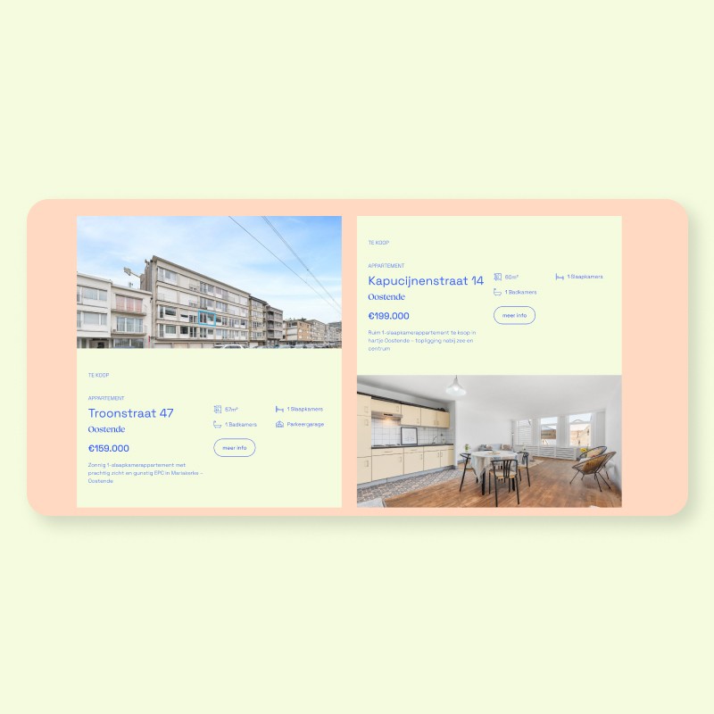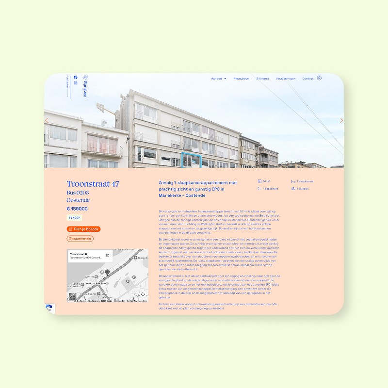 Tegelijk moest het platform technisch naadloos functioneren, met een live integratie met vastgoedsoftware Zabun die elk nieuw pand automatisch in de juiste branding op de website plaatst, en een dynamisch blog dat Signatuur zelfstandig beheert via een gebruiksvriendelijk admin portaal.