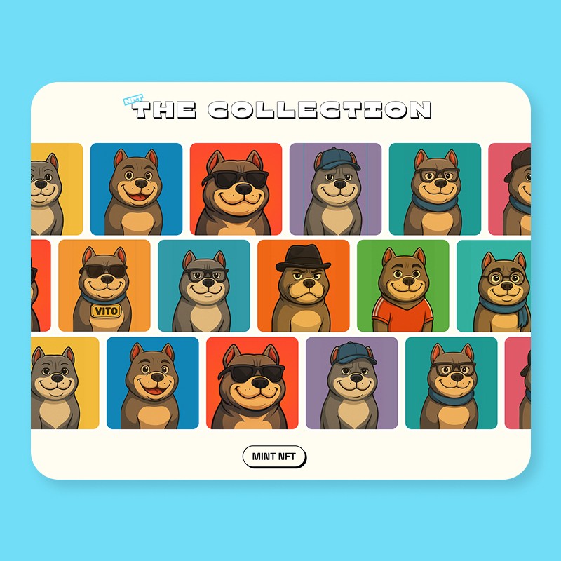 Een overzichtelijke collectiesectie waar alle Vito-NFT’s speels en helder worden gepresenteerd. De kleurrijke gridstructuur benadrukt variatie en persoonlijkheid, terwijl de opbouw bezoekers uitnodigt om verder te ontdekken en te minten.