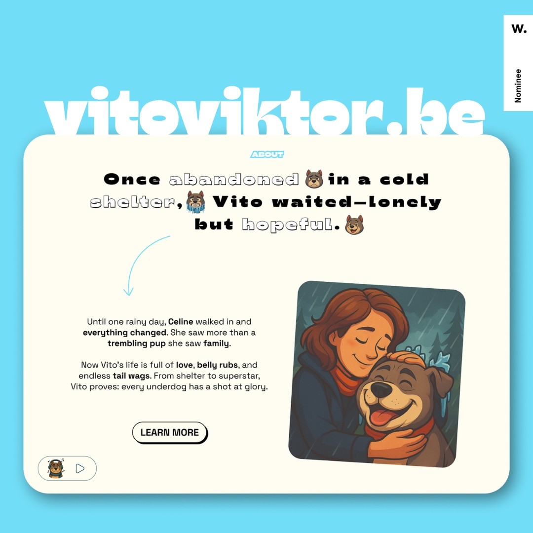 Een hartverwarmende about-sectie die Vito’s verhaal vertelt in een speelse, emotionele stijl. Illustraties, emoji’s en zachte typografie brengen zijn reis van asielhond tot geliefde “little hippo” tot leven.
